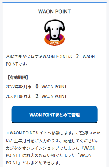 - カジタクオンラインショップでためたWAON POINTと、イオンのお店でためたWAON POINTをまとめていただいた方は、まとめた累計ポイントが表示されます(カジタク オンラインショップでためたWAON POINTと、お店でためたWAON POINTを合算してご利用いただくには、別途ポイントおまとめの手続きが必要です)。