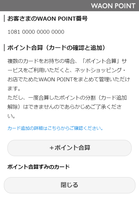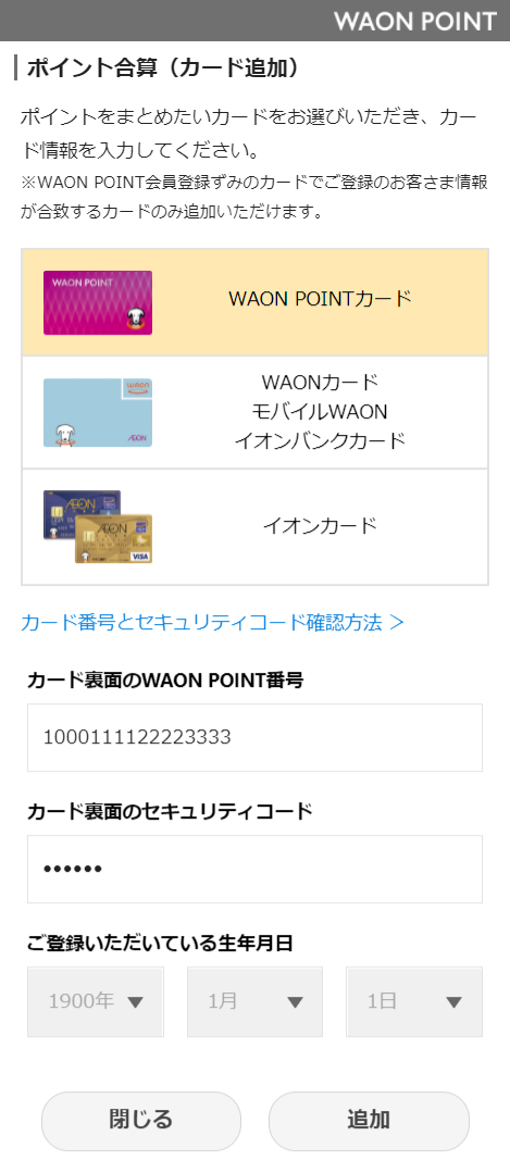 ※すでにsmart WAONでポイントをまとめて管理されている場合、上記ステップで追加されたカードに紐づく他のカード情報も表示されます。