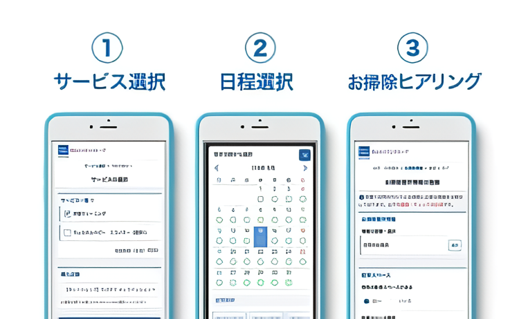 見積り訪問なし!お掃除に来て欲しい日時を選択、必要情報を入力して予約完了。2回目からは最短2分で予約可能。